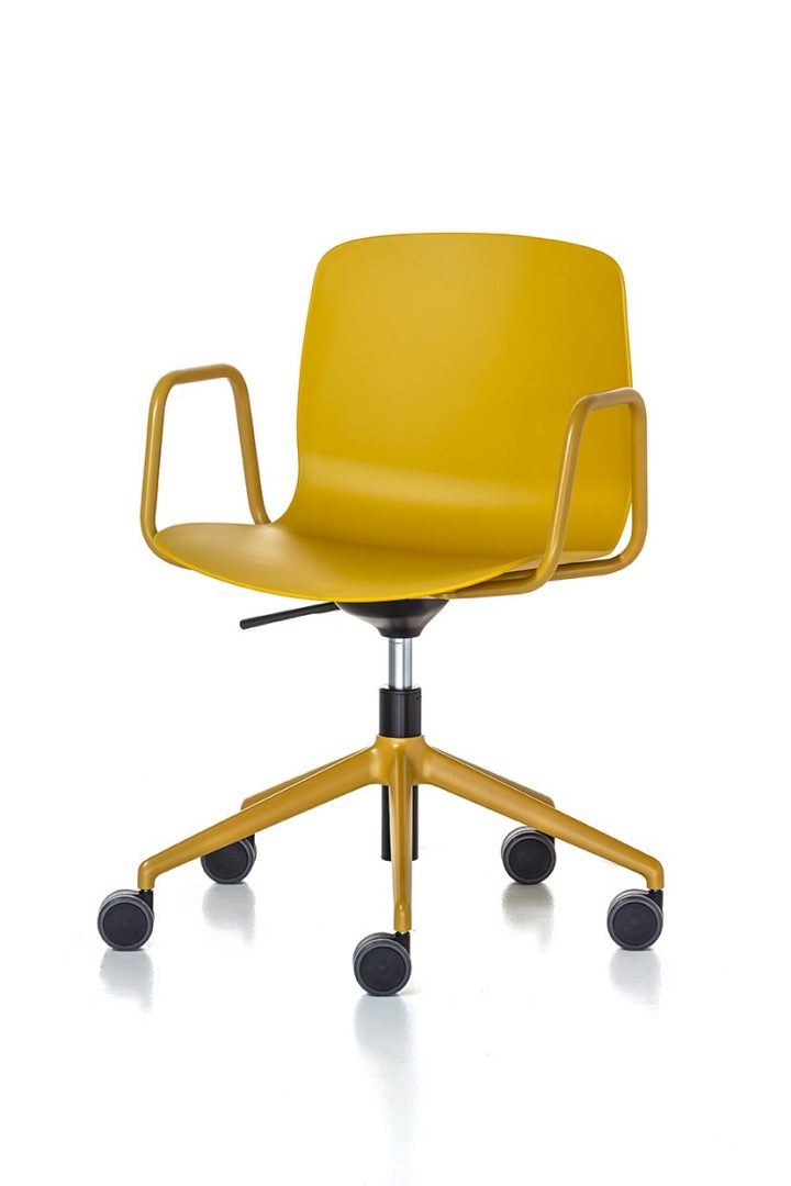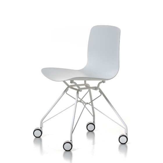 כיסא עם מעטפת פוליפרופילן, עם חזית מרופדת בבד, עור, דמוי עור, עור או מרופד לחלוטין. בסיס "וינטג'" טרסטלי עם גלגלים, מצופה אבקה.